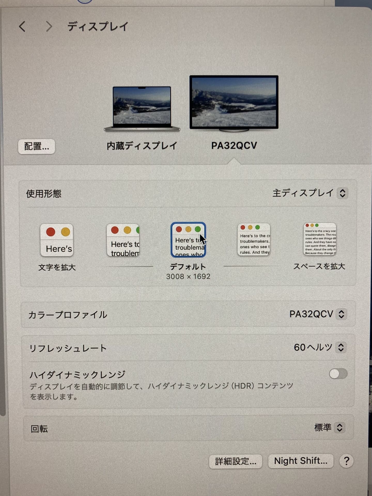 これでもいいけど、6KのRetina恩恵が受けられておらずデフォルト3008╳1692表示になっていません。「ディスプレイ」の設定をいじって、全ての解像度を表示しても出てこない…。これでは6Kを購入した意味がなくて不満です!